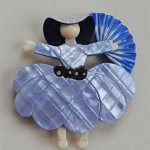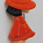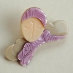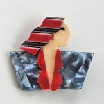 Léa’s brooches were created in two periods. Firstly vintage (1969 to 1981) which became increasingly popular in the late 80’s and then the modern period from 1991 onwards. Her brooches mainly consist of animals, cars and celebrities with some of her pieces thought to resemble a more Art Deco style which are often wrongly dated to that of the late 1920’s. Each piece features a distinct trademark to identify its roots and obvious value, carrying a unique v-shaped metal clasp (Shown below) and most importantly inscribed is the name of the famous ‘Léa Stein’. Some collectors may use this to determine the era in which a piece was created. Whereby ‘vintage’ brooches feature clasps that were heat mounted onto the plastic, the more modern brooches, although the same clasp design, were riveted on. Some earlier brooch designs have had the clasp but do not hold the designers key inscription.
