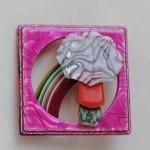 Léa’s most valuable pieces include the Serigraphy pins and buckles, a plastic / celluloid version of Victorian miniatures. Serigraphy is a fine art, produced by colour stencil printmaking process, creating what looks like fine miniature paintings.
